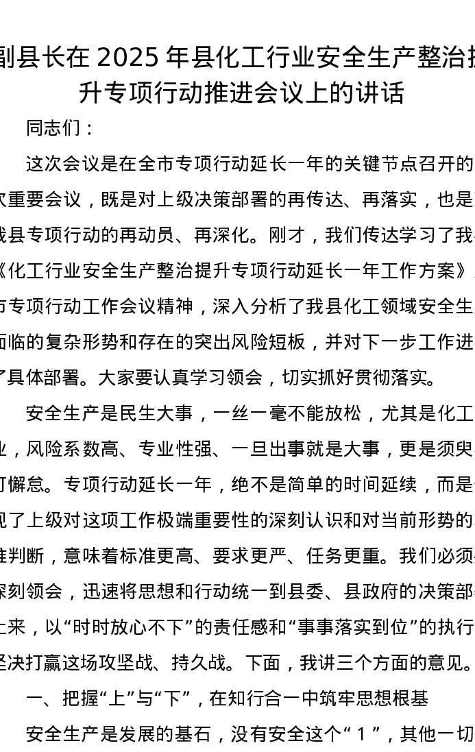 副县长在2025年县化工行业安全生产整治提升专项行动推进会议上的讲话