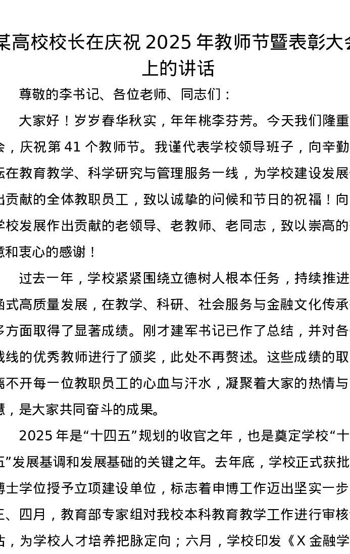 某高校校长在庆祝2025年教师节暨表彰大会上的讲话