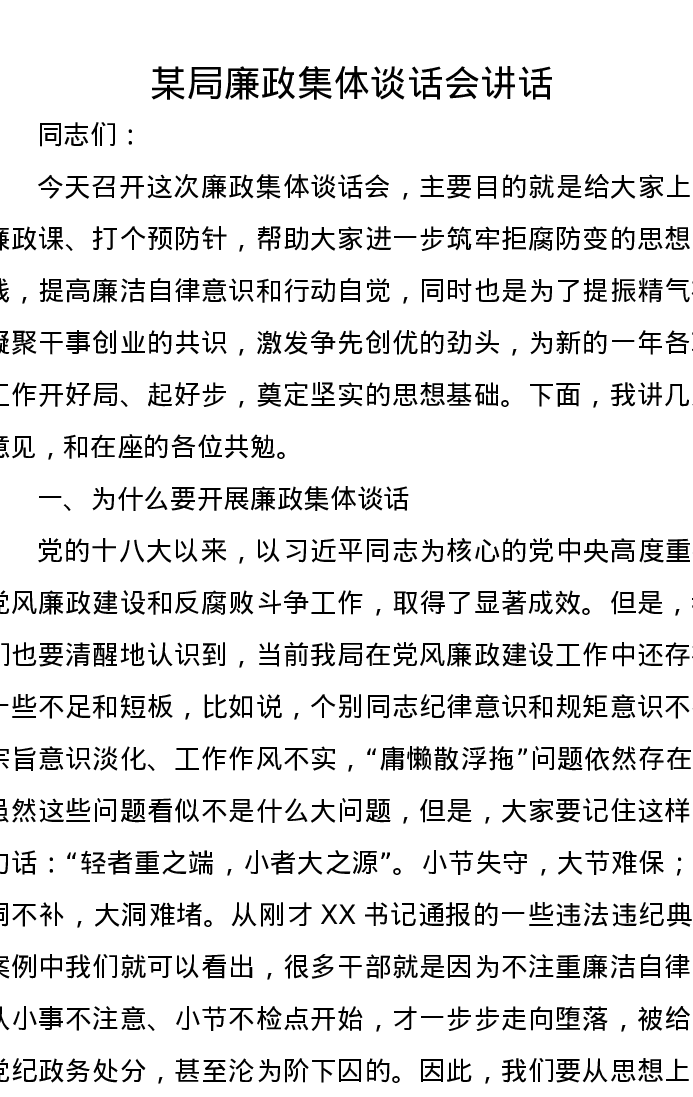 某局廉政集体谈话会讲话