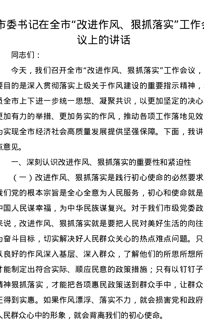 市委书记在全市“改进作风、狠抓落实”工作会议上的讲话