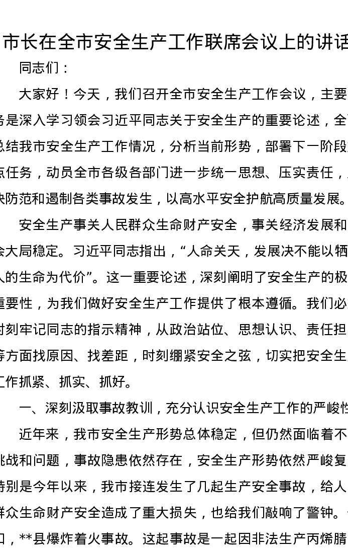 市长在全市安全生产工作联席会议上的讲话