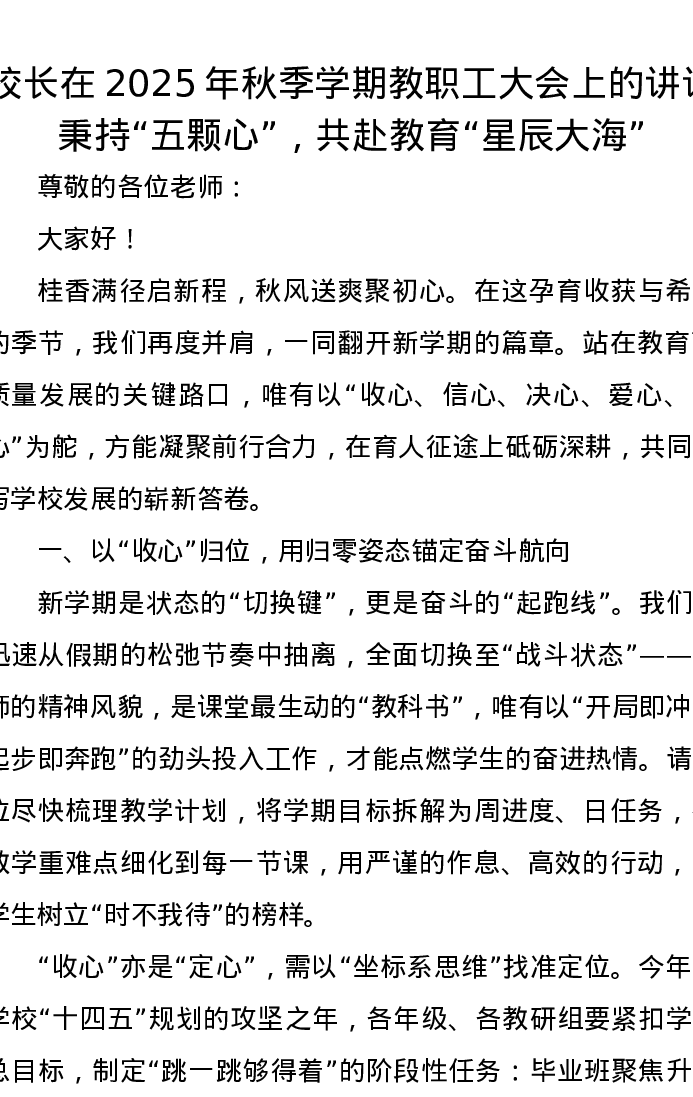 校长在2025年秋季学期教职工大会上的讲话:秉持“五颗心”,共赴教育“星辰大海”