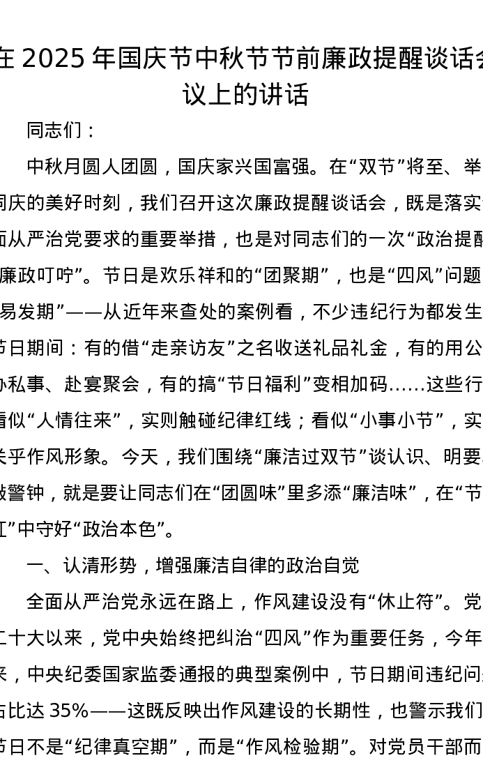在2025年国庆节中秋节节前廉政提醒谈话会议上的讲话