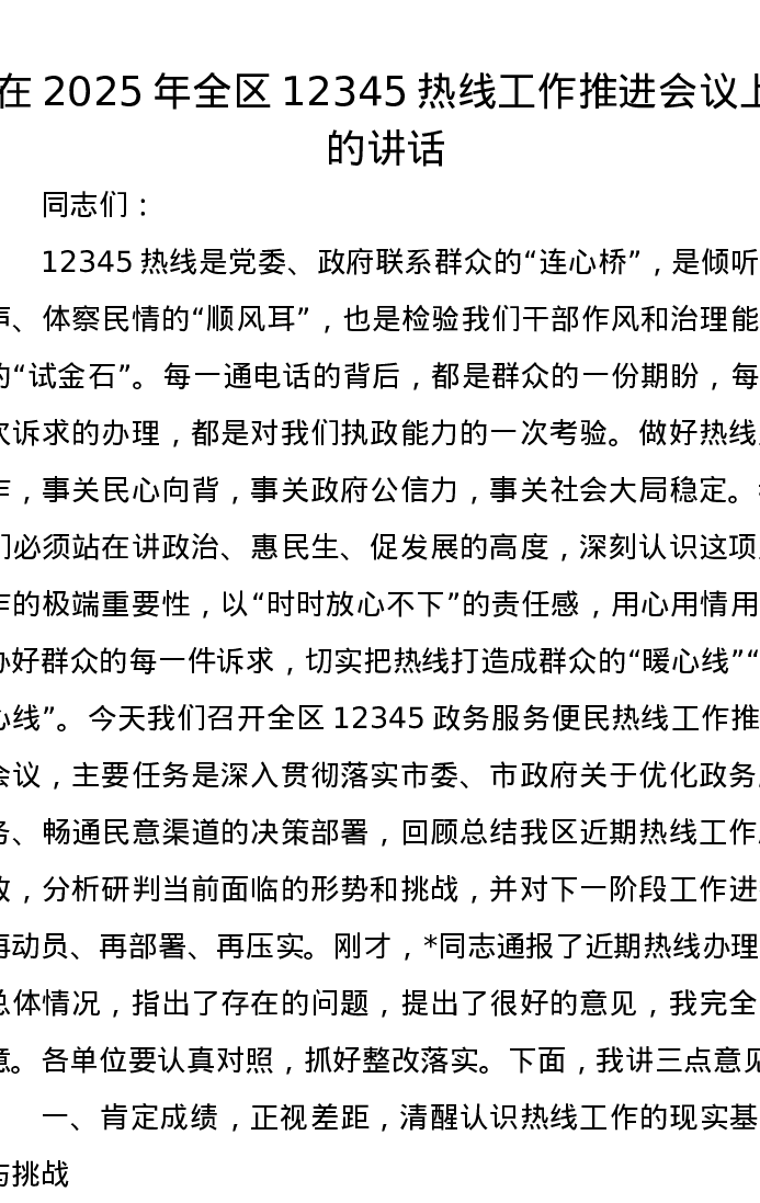 在2025年全区12345热线工作推进会议上的讲话