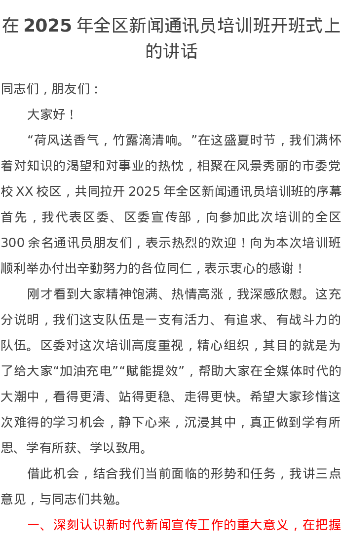 在2025年全区新闻通讯员培训班开班式上的讲话