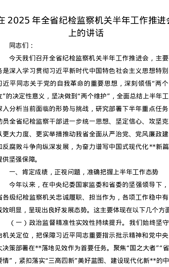 在2025年全省纪检监察机关半年工作推进会上的讲话