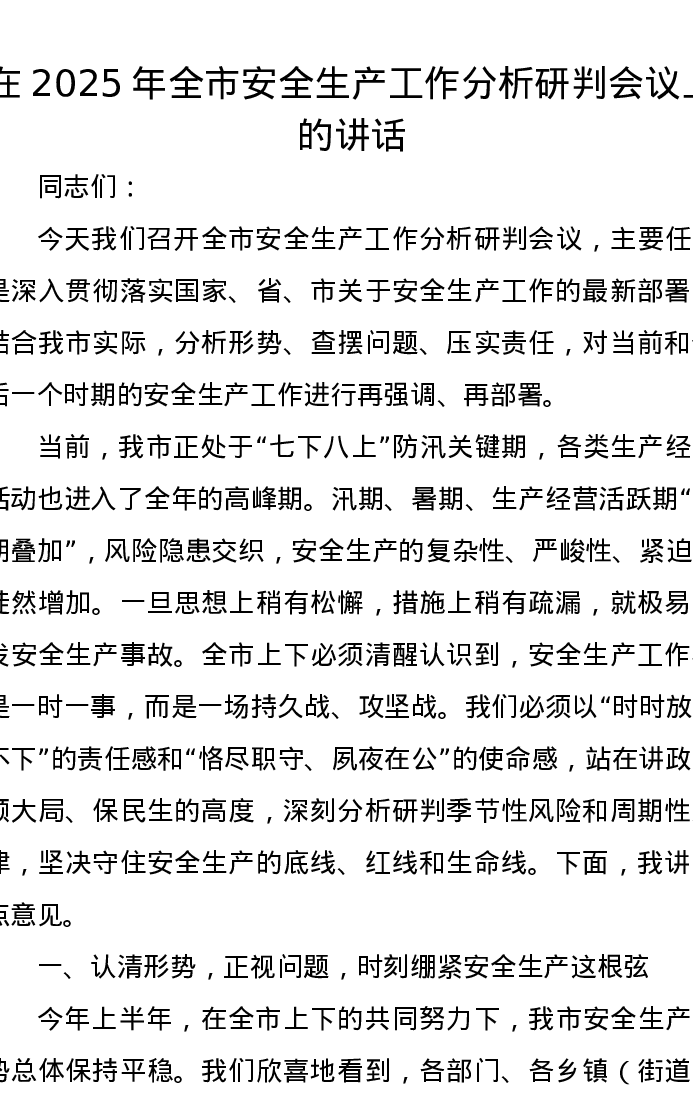 在2025年全市安全生产工作分析研判会议上的讲话