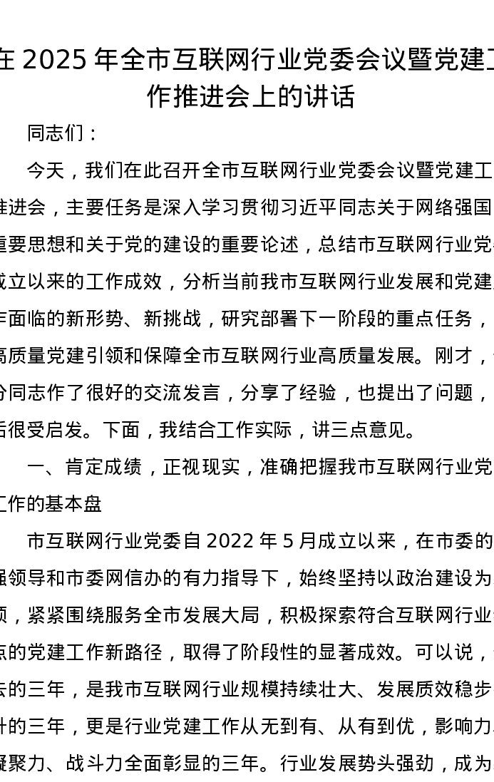 在2025年全市互联网行业党委会议暨党建工作推进会上的讲话
