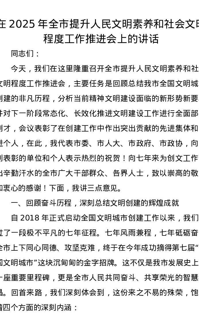 在2025年全市提升人民文明素养和社会文明程度工作推进会上的讲话
