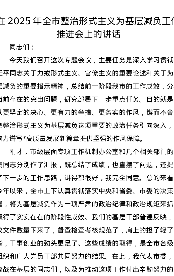 在2025年全市整治形式主义为基层减负工作推进会上的讲话