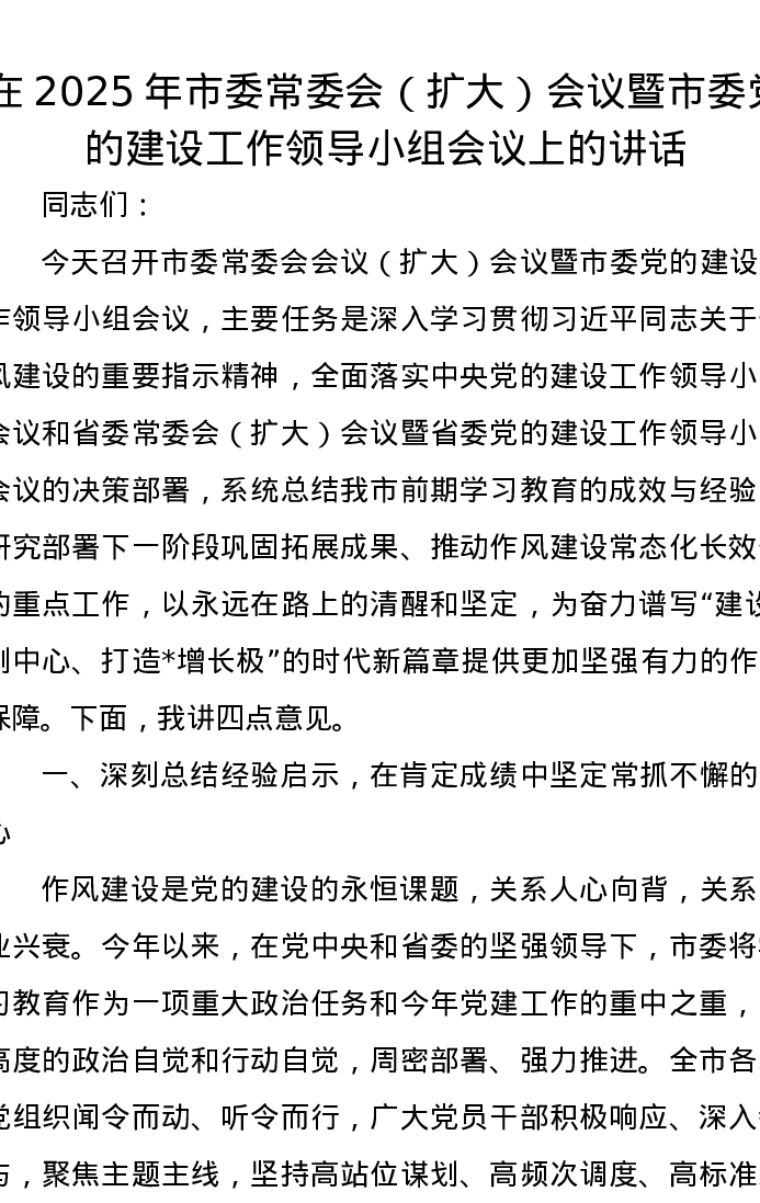 在2025年市委常委会(扩大)会议暨市委党的建设工作领导小组会议上的讲话