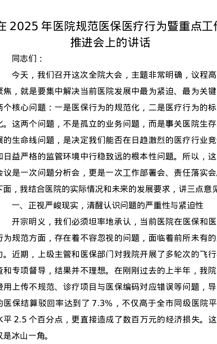 在2025年医院规范医保医疗行为暨重点工作推进会上的讲话