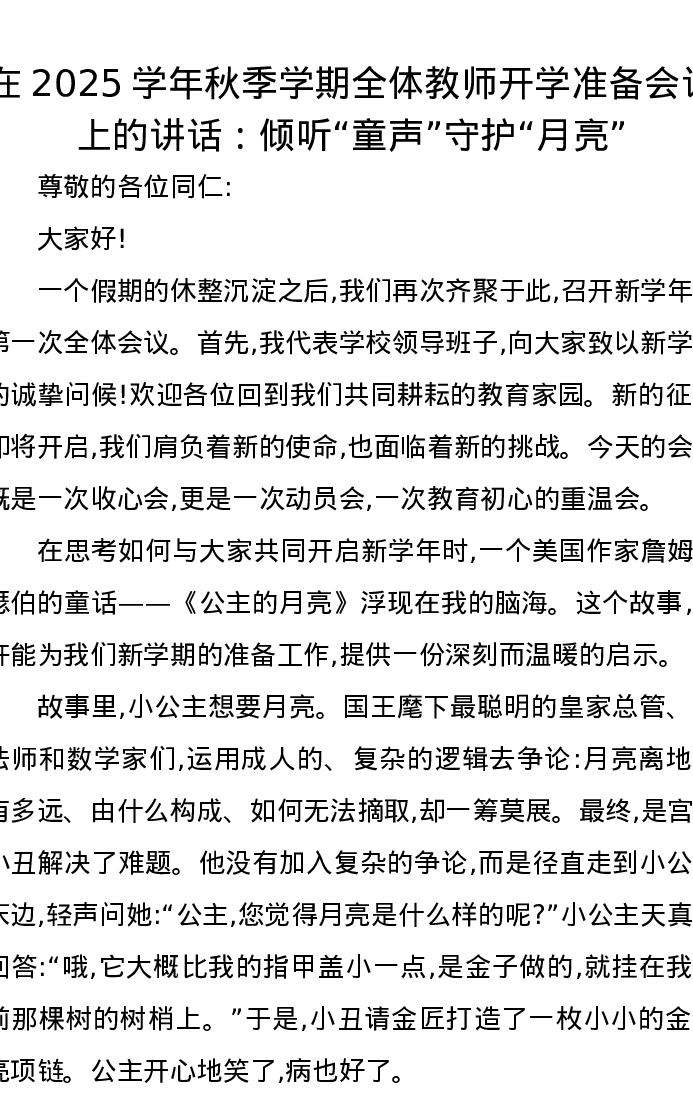 在2025学年秋季学期全体教师开学准备会议上的讲话:倾听“童声”守护“月亮”