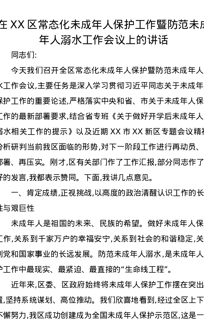 在XX区常态化未成年人保护工作暨防范未成年人溺水工作会议上的讲话