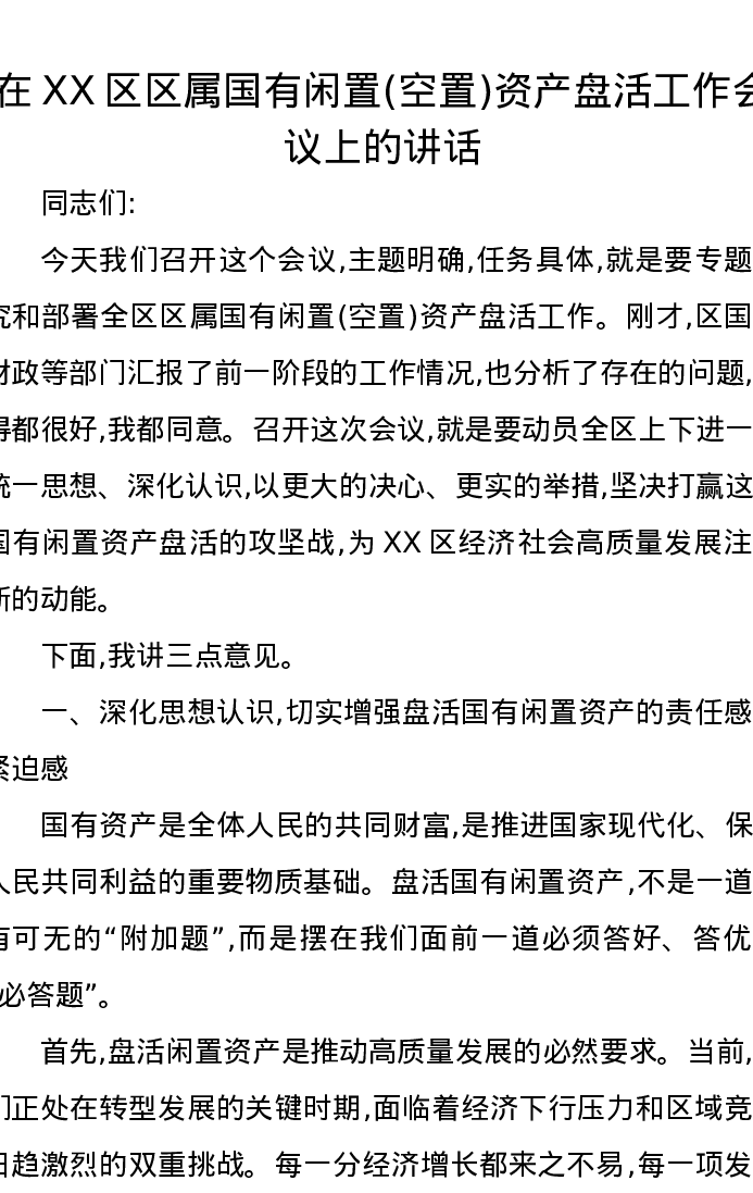 在XX区区属国有闲置(空置)资产盘活工作会议上的讲话