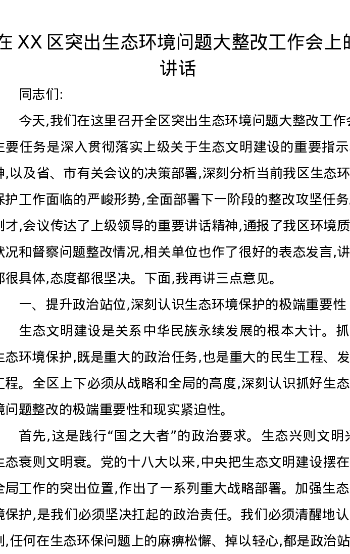 在XX区突出生态环境问题大整改工作会上的讲话