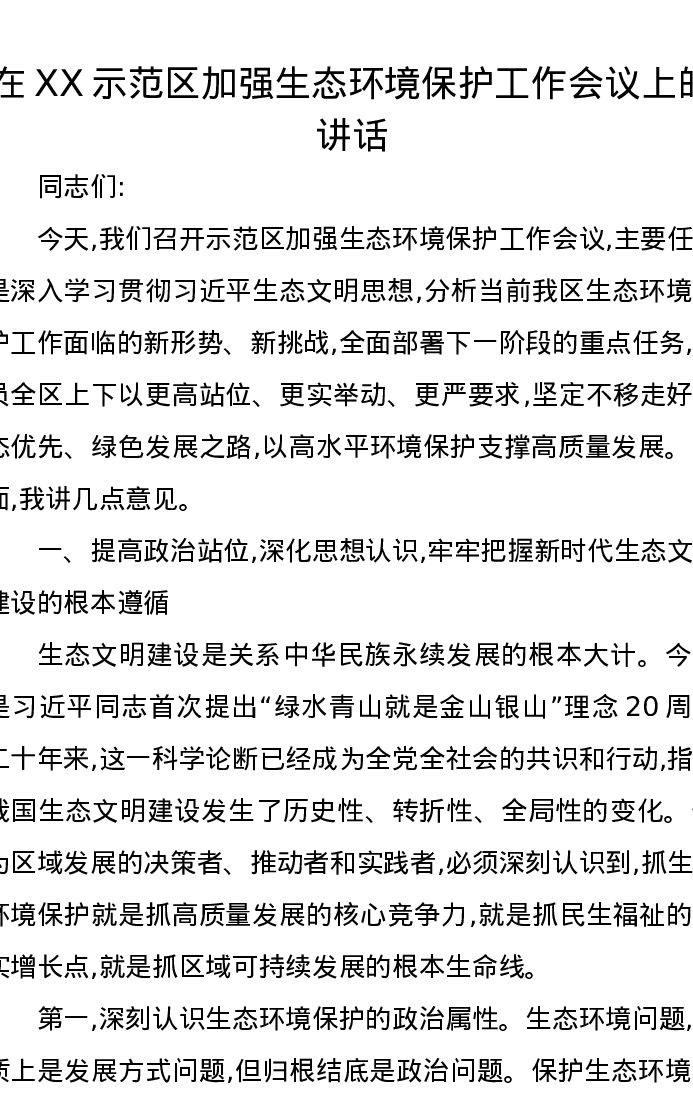 在XX示范区加强生态环境保护工作会议上的讲话