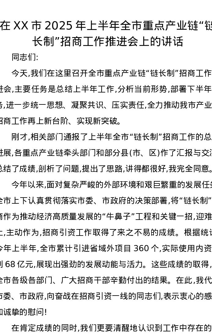 在XX市2025年上半年全市重点产业链“链长制”招商工作推进会上的讲话