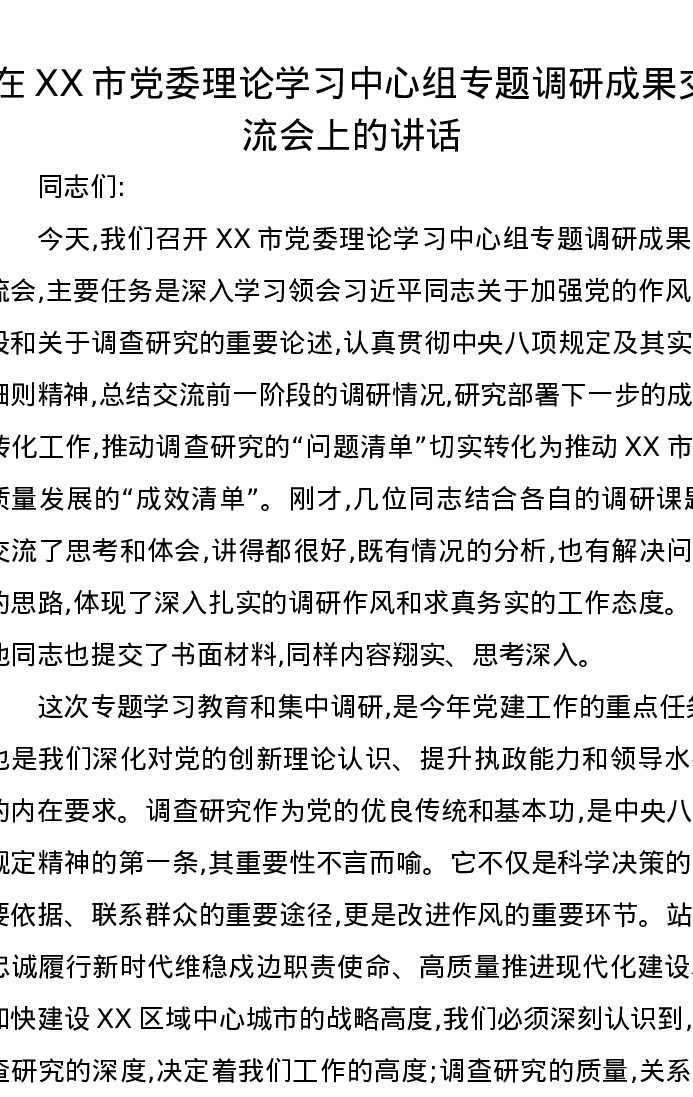 在XX市党委理论学习中心组专题调研成果交流会上的讲话