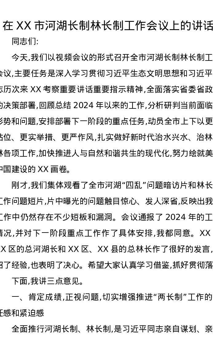 在XX市河湖长制林长制工作会议上的讲话