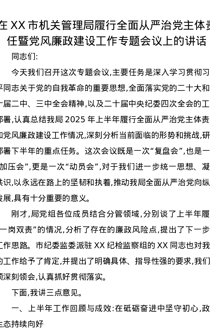 在XX市机关管理局履行全面从严治党主体责任暨党风廉政建设工作专题会议上的讲话