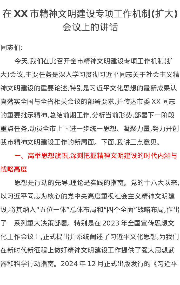 在XX市精神文明建设专项工作机制(扩大)会议上的讲话