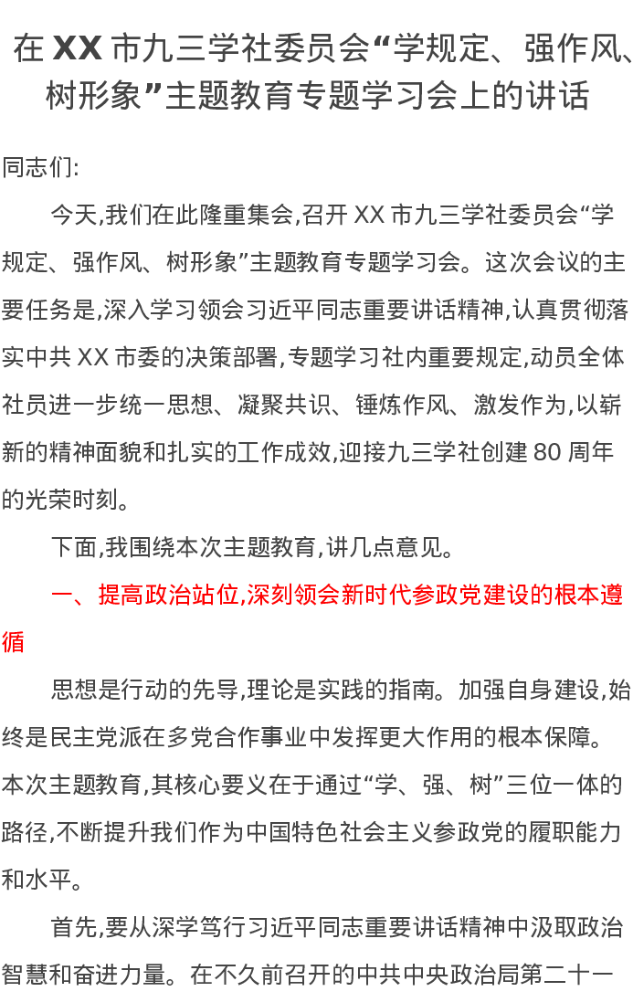 在XX市九三学社委员会“学规定、强作风、树形象”主题教育专题学习会上的讲话