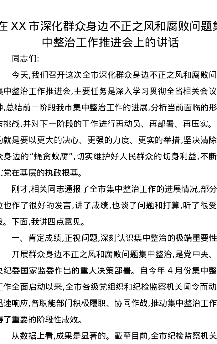 在XX市深化群众身边不正之风和腐败问题集中整治工作推进会上的讲话