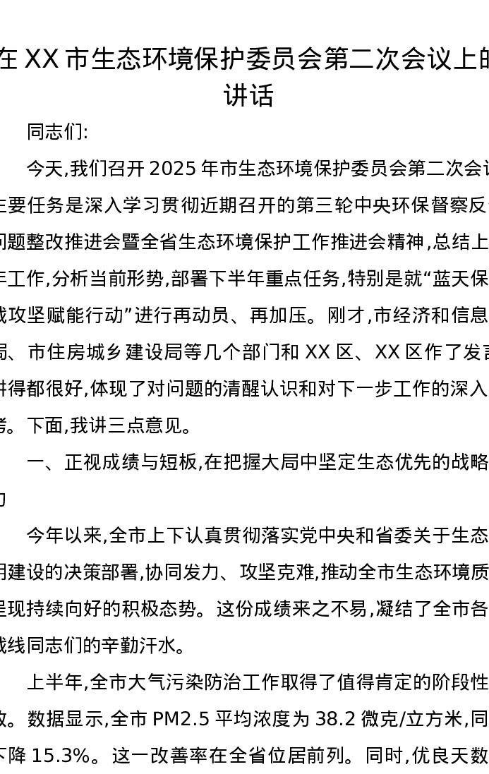 在XX市生态环境保护委员会第二次会议上的讲话