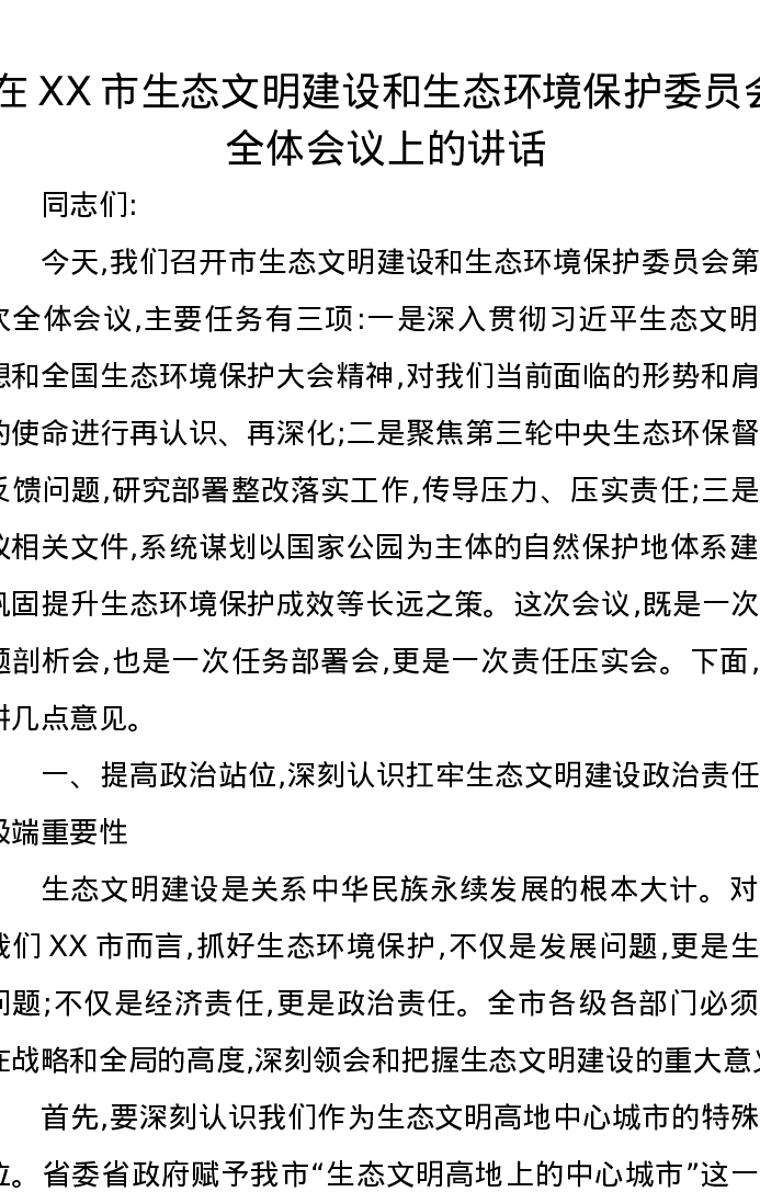 在XX市生态文明建设和生态环境保护委员会全体会议上的讲话