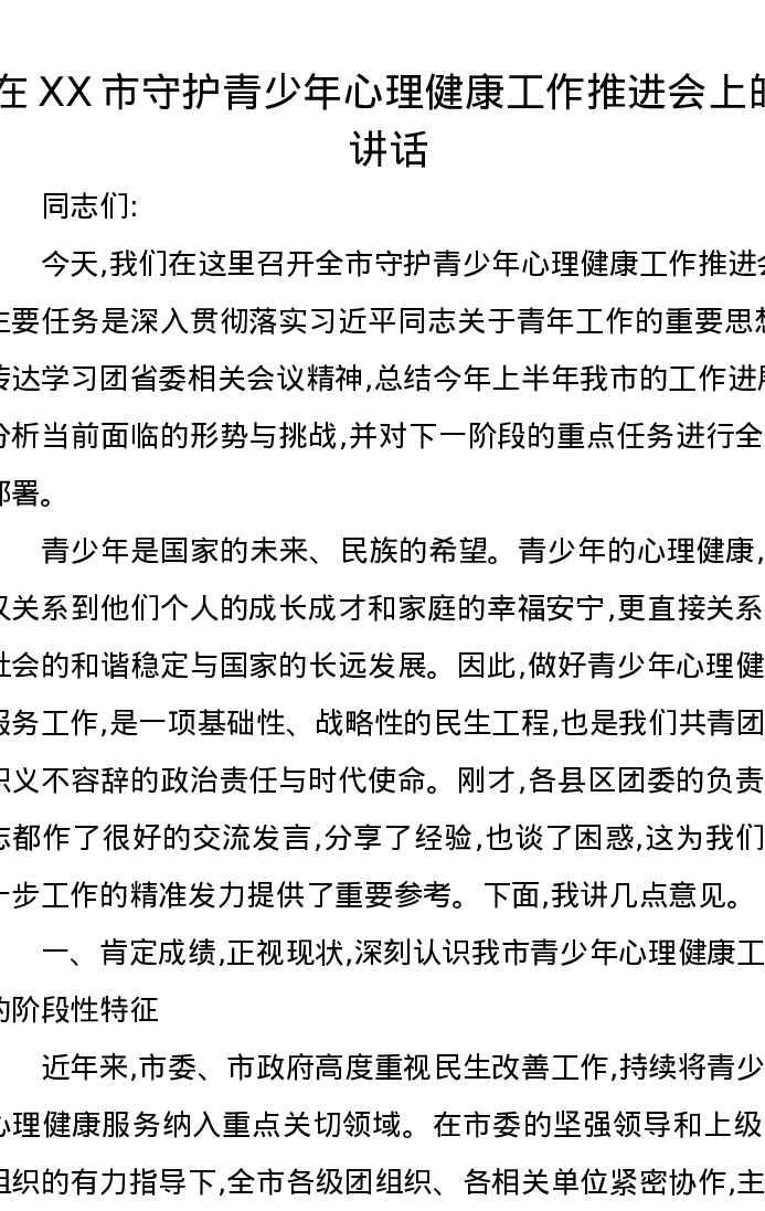 在XX市守护青少年心理健康工作推进会上的讲话
