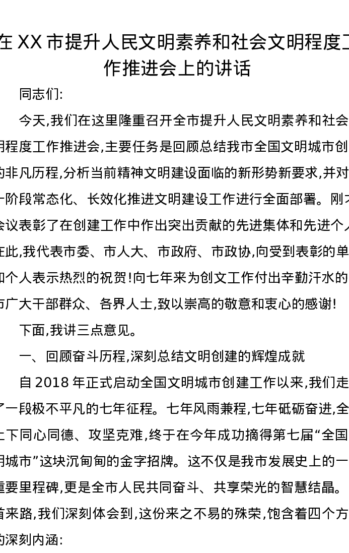 在XX市提升人民文明素养和社会文明程度工作推进会上的讲话