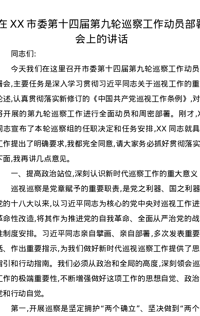 在XX市委第十四届第九轮巡察工作动员部署会上的讲话