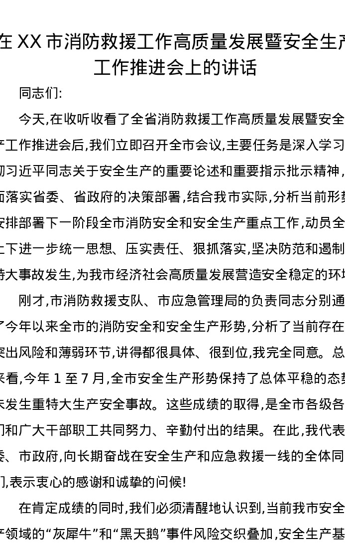 在XX市消防救援工作高质量发展暨安全生产工作推进会上的讲话