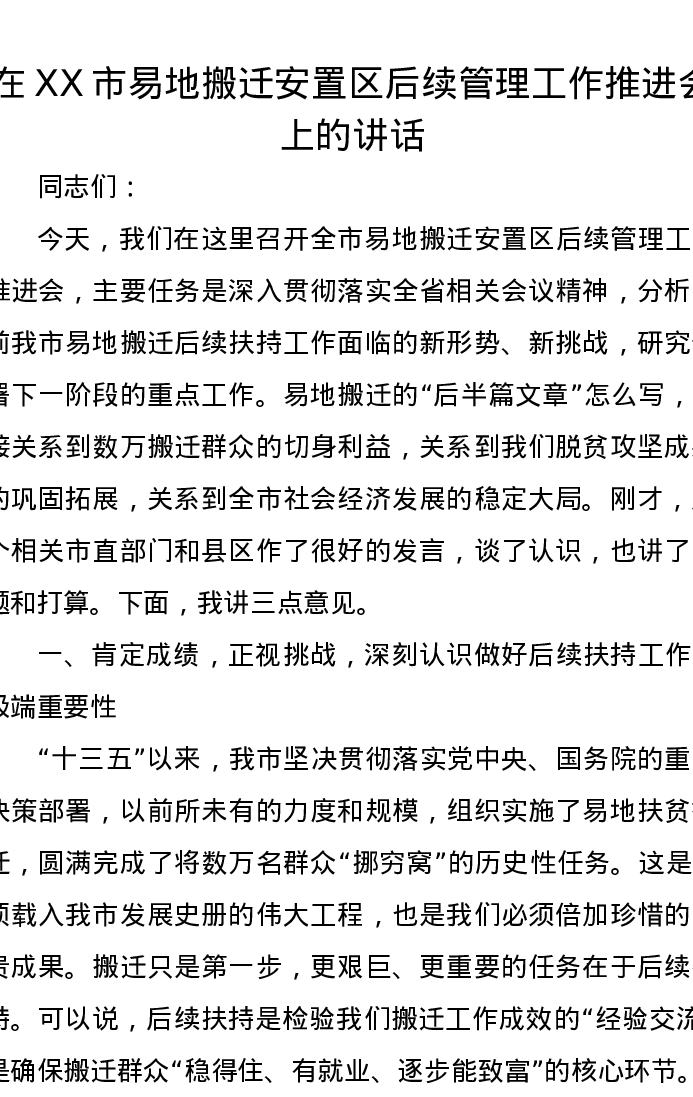 在XX市易地搬迁安置区后续管理工作推进会上的讲话
