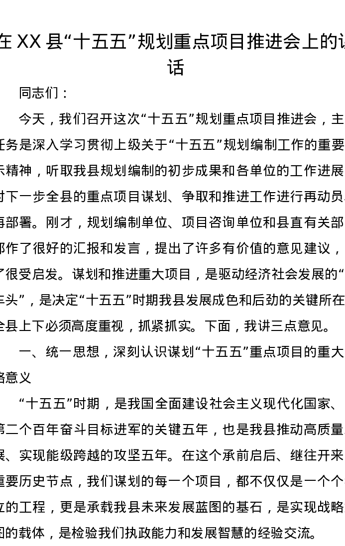 在XX县“十五五”规划重点项目推进会上的讲话