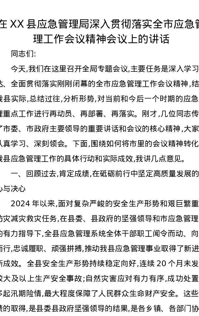 在XX县应急管理局深入贯彻落实全市应急管理工作会议精神会议上的讲话