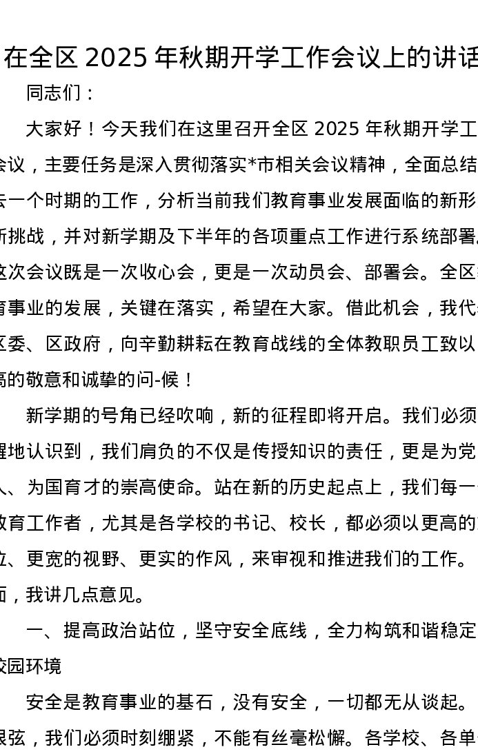 在全区2025年秋期开学工作会议上的讲话