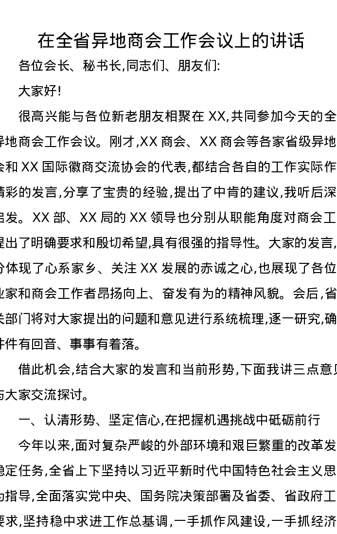 在全省异地商会工作会议上的讲话