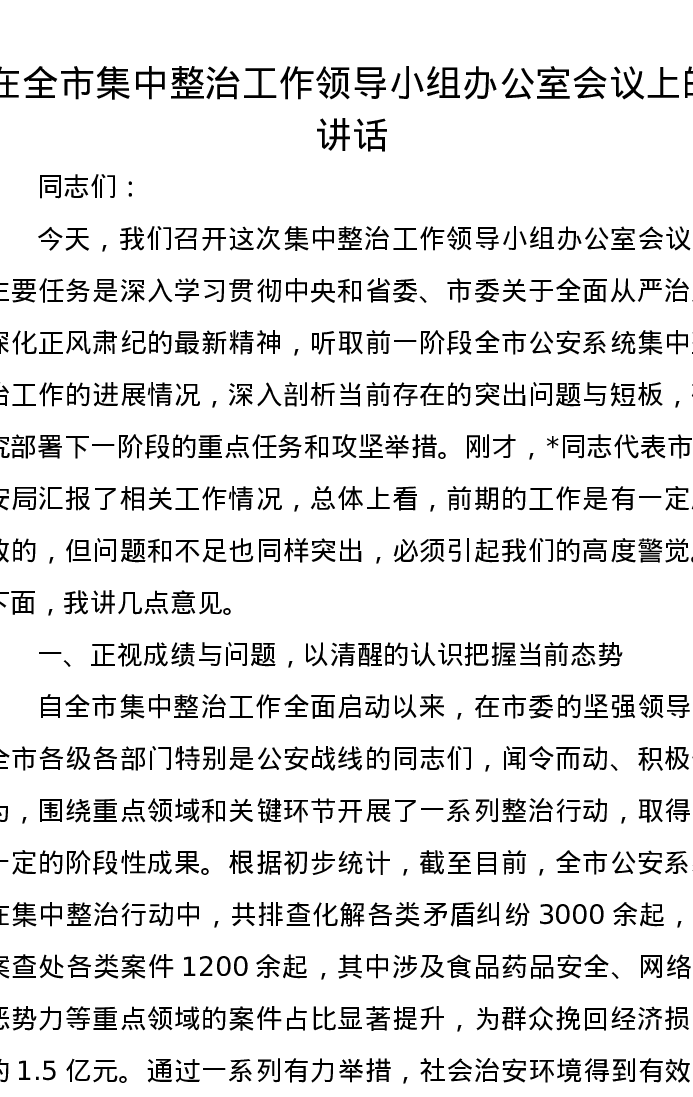 在全市集中整治工作领导小组办公室会议上的讲话