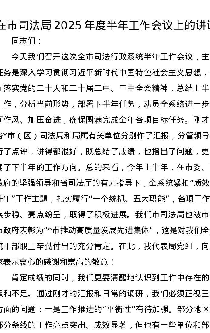 在市司法局2025年度半年工作会议上的讲话