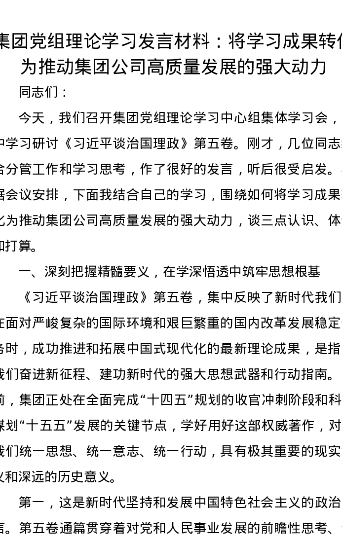 集团党组理论学习发言材料:将学习成果转化为推动集团公司高质量发展的强大动力