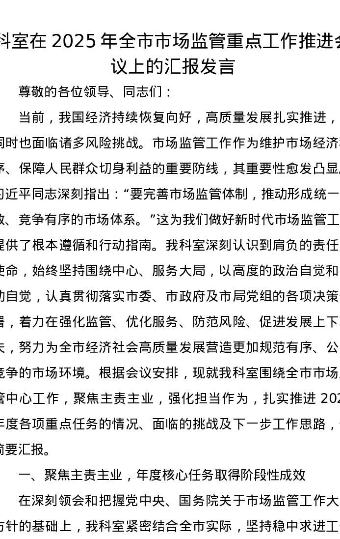 科室在2025年全市市场监管重点工作推进会议上的汇报发言