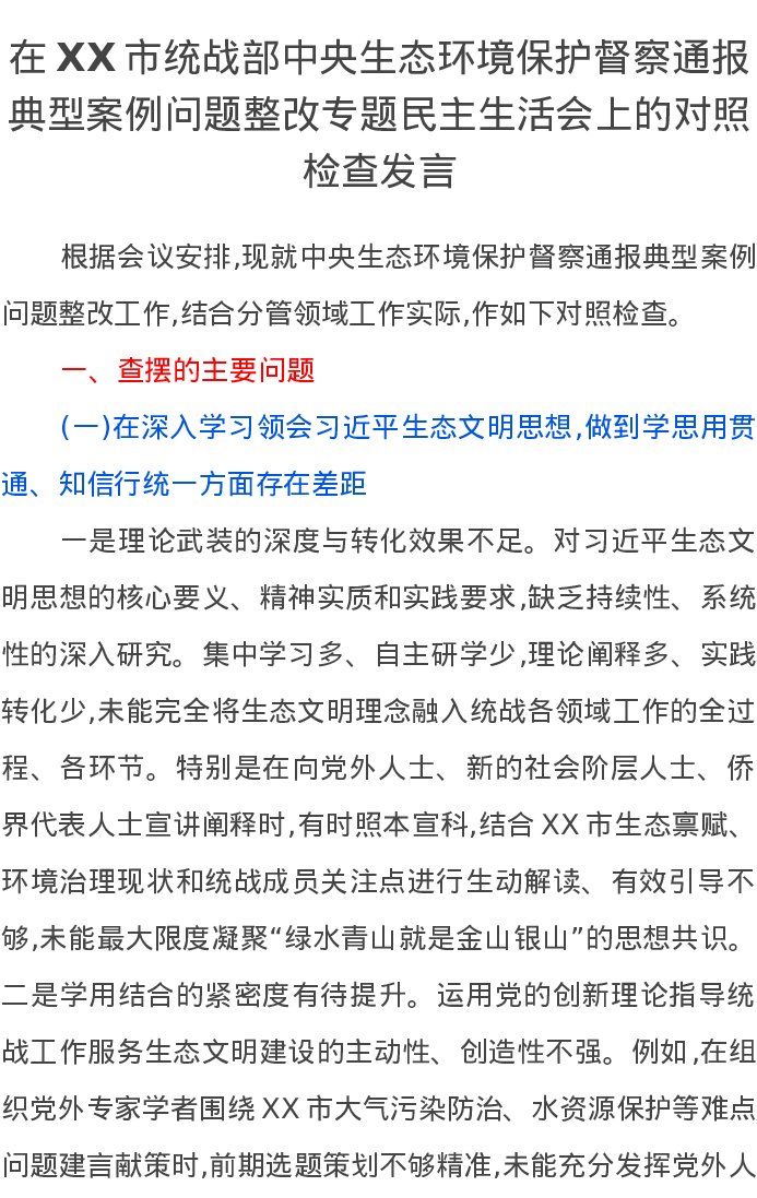 在XX市统战部中央生态环境保护督察通报典型案例问题整改专题民主生活会上的对照检查发言