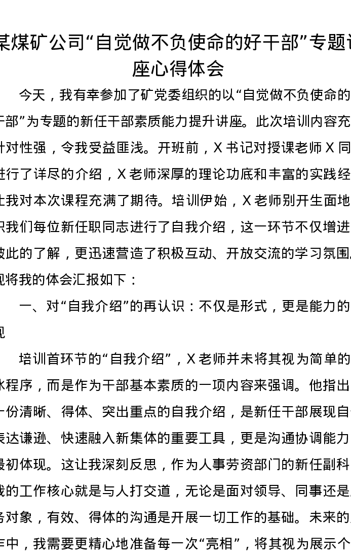 某煤矿公司“自觉做不负使命的好干部”专题讲座心得体会