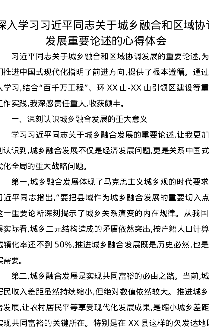 深入学习习近平总书记关于城乡融合和区域协调发展重要论述的心得体会