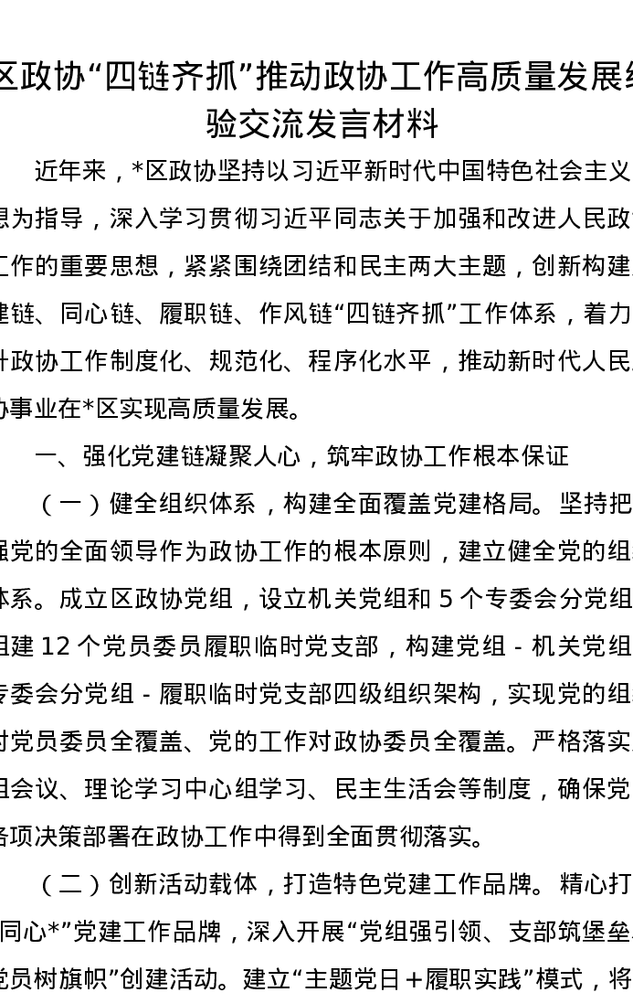 区政协“四链齐抓”推动政协工作高质量发展经验交流发言材料