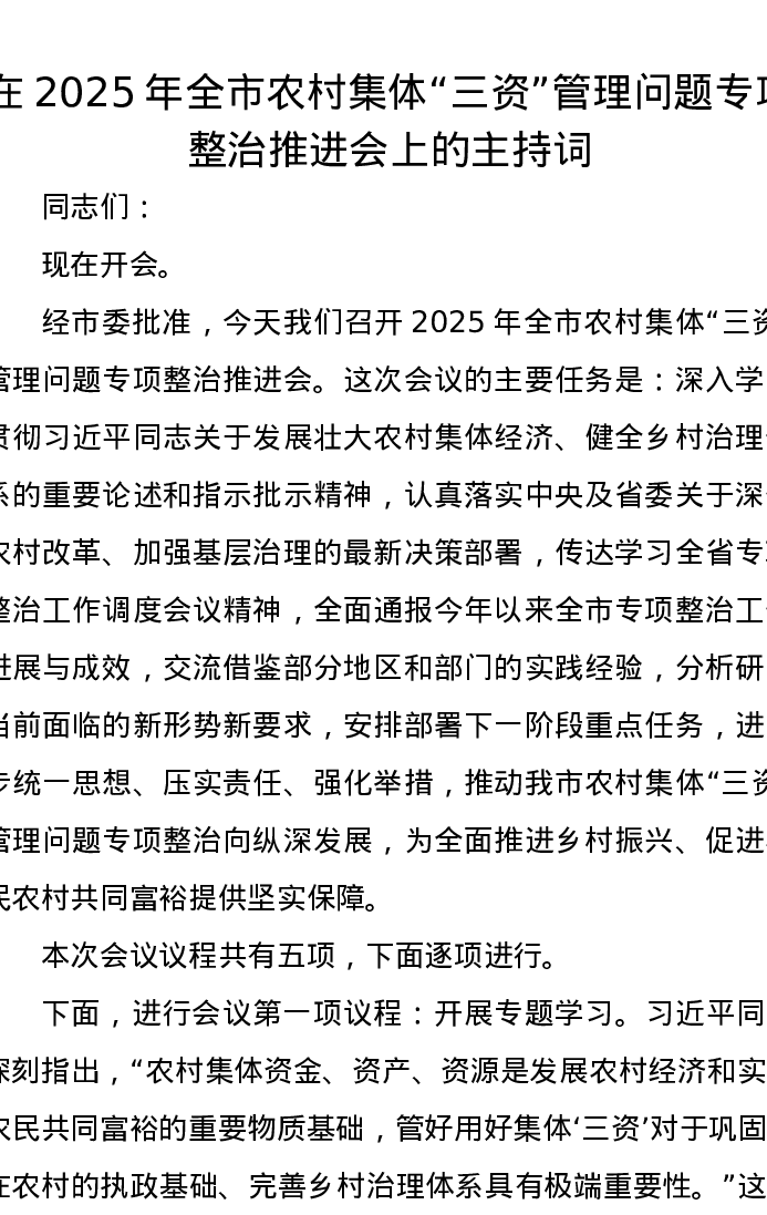 在2025年全市农村集体“三资”管理问题专项整治推进会上的主持词