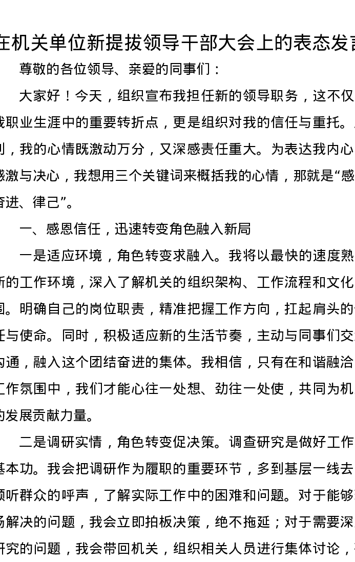在机关单位新提拔领导干部大会上的表态发言