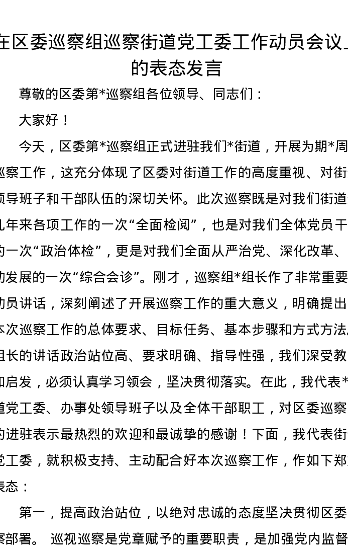 在区委巡察组巡察街道党工委工作动员会议上的表态发言